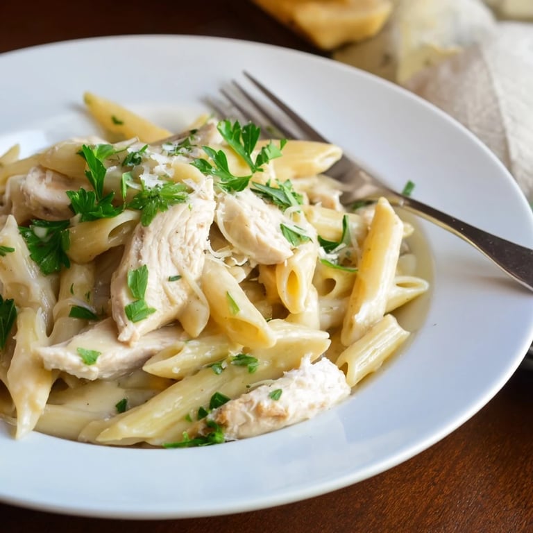 Crisp Pinot Grigio or light Chardonnay work beautifully. The acidity cuts through the richness of the cream sauce while complementing the savory roasted garlic and chicken. Avoid heavy reds that would overpower the delicate flavors.
