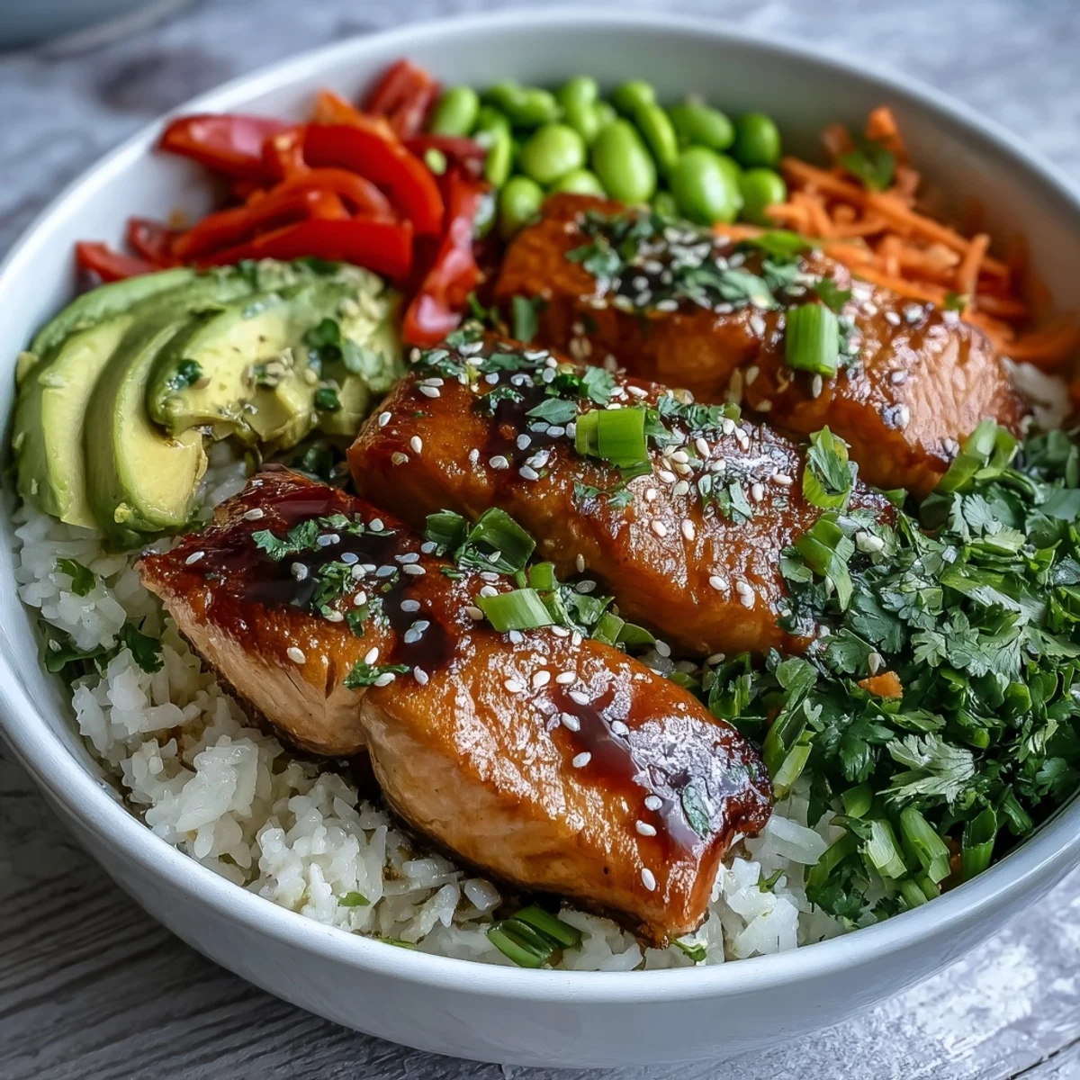 Pin it This bowl is designed to satisfy both your taste buds and your health goals. The contrast between the warm, seared salmon and the cool, creamy avocado, paired with the crunch of edamame and carrots, creates a delightful texture in every bite.